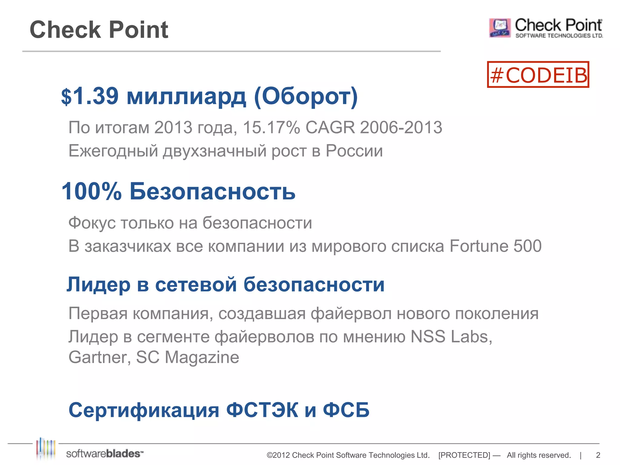 Документ описывает решения в области сетевой безопасности компании Check Point, включая их последние достижения и основные задачи для защиты данных и систем. Компания утверждает, что она является мировым лидером в области сетевой безопасности с высокой эффективностью и надежностью своих продуктов. В документе также представлены сертификации и технологии, обеспечивающие защиту от различных киберугроз.