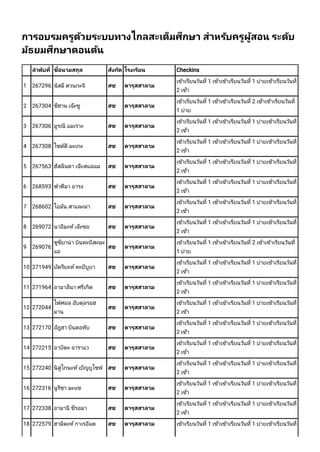 ชื่อนามสกุล สังกัด โรงเรียน Checkins 1 267296 นัสมี ตวนกะจิ สช ดารุสสาลาม เขาเรียนวันที่ 1 เชาเขาเรียนวันที่ 1 บายเขาเรียนวันที่ 2 เชา 2 267304 ซีฮาน เจะซู สช ดารุสสาลาม เขาเรียนวันที่ 1 เชาเขาเรียนวันที่ 2 เชาเขาเรียนวันที่ 1 บาย 3 267306 มูรณี แมเราะ สช ดารุสสาลาม เขาเรียนวันที่ 1 เชาเขาเรียนวันที่ 1 บายเขาเรียนวันที่ 2 เชา 4 267308 ไซดดี มะเกะ สช ดารุสสาลาม เขาเรียนวันที่ 1 เชาเขาเรียนวันที่ 1 บายเขาเรียนวันที่ 2 เชา 5 267563 ฮัสลินดา เจะสแลแม สช ดารุสสาลาม เขาเรียนวันที่ 1 เชาเขาเรียนวันที่ 1 บายเขาเรียนวันที่ 2 เชา 6 268593 ฟาตีมา อารง สช ดารุสสาลาม เขาเรียนวันที่ 1 เชาเขาเรียนวันที่ 1 บายเขาเรียนวันที่ 2 เชา 7 268602 ไอมัน สาและมา สช ดารุสสาลาม เขาเรียนวันที่ 1 เชาเขาเรียนวันที่ 1 บายเขาเรียนวันที่ 2 เชา 8 269072 นาอีมะห เจะซอ สช ดารุสสาลาม เขาเรียนวันที่ 1 เชาเขาเรียนวันที่ 1 บายเขาเรียนวันที่ 2 เชา 9 269076 ซูซียานา บินหะยีสะมะ แอ สช ดารุสสาลาม เขาเรียนวันที่ 1 เชาเขาเรียนวันที่ 2 เชาเขาเรียนวันที่ 1 บาย 10 271949 บัดรียะห หะยีบูยา สช ดารุสสาลาม เขาเรียนวันที่ 1 เชาเขาเรียนวันที่ 1 บายเขาเรียนวันที่ 2 เชา 11 271964 อามาลีนา ศรีเกิด สช ดารุสสาลาม เขาเรียนวันที่ 1 เชาเขาเรียนวันที่ 1 บายเขาเรียนวันที่ 2 เชา 12 272044 ไฟศอล อับดุลรอฮ มาน สช ดารุสสาลาม เขาเรียนวันที่ 1 เชาเขาเรียนวันที่ 1 บายเขาเรียนวันที่ 2 เชา 13 272170 อัฎฮา บินดอหับ สช ดารุสสาลาม เขาเรียนวันที่ 1 เชาเขาเรียนวันที่ 1 บายเขาเรียนวันที่ 2 เชา 14 272215 อาบีดะ จาราแว สช ดารุสสาลาม เขาเรียนวันที่ 1 เชาเขาเรียนวันที่ 1 บายเขาเรียนวันที่ 2 เชา 15 272240 นิสูไกนะห เบ็ญยูโซฟ สช ดารุสสาลาม เขาเรียนวันที่ 1 เชาเขาเรียนวันที่ 1 บายเขาเรียนวันที่ 2 เชา 16 272316 นูรีซา มะแซ สช ดารุสสาลาม เขาเรียนวันที่ 1 เชาเขาเรียนวันที่ 1 บายเขาเรียนวันที่ 2 เชา 17 272338 อามานี ซีรอมา สช ดารุสสาลาม เขาเรียนวันที่ 1 เชาเขาเรียนวันที่ 1 บายเขาเรียนวันที่ 2 เชา 18 272579 ฮามีดะห กาเรอีแต สช ดารุสสาลาม เขาเรียนวันที่ 1 เชาเขาเรียนวันที่ 1 บายเขาเรียนวันที่