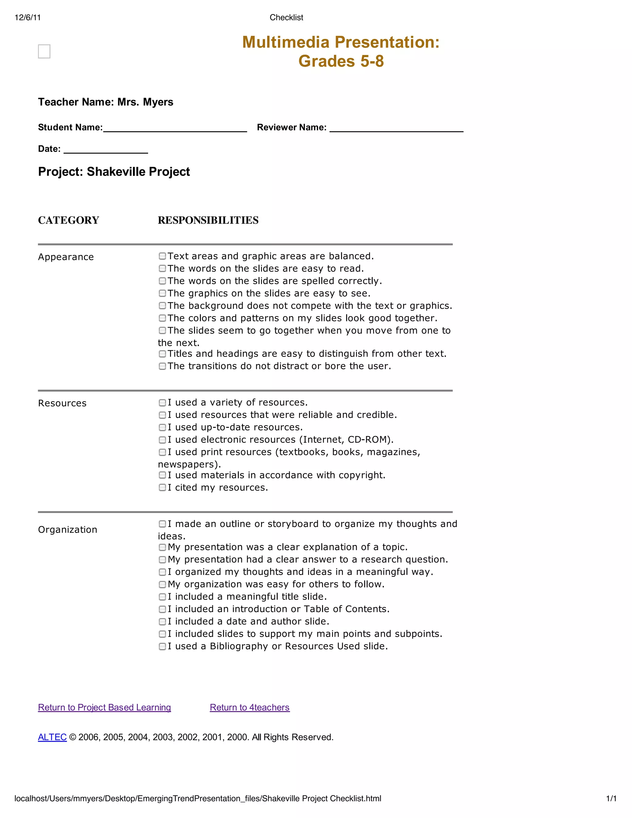 The document is a checklist for a multimedia presentation project for grades 5-8. It includes categories for Appearance, Resources, and Organization. Under Appearance, it lists responsibilities for text and graphic layout, readability, spelling, and visual design. The Resources section addresses using a variety of reliable sources. The Organization section covers outlining, clear explanations, titles, introductions, citations, and supporting main points. The checklist provides criteria for students to ensure their multimedia presentations meet standards for visual design, sourcing, and structural organization.