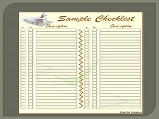 The document discusses the use and characteristics of checklists in educational settings, highlighting their purpose in tracking task completion and assessing student behaviors and skills. It outlines the format, characteristics, and merits of checklists, emphasizing the importance of clarity and practicality. Checklists serve as effective tools for both teachers and students in formative assessments and personal development evaluations.