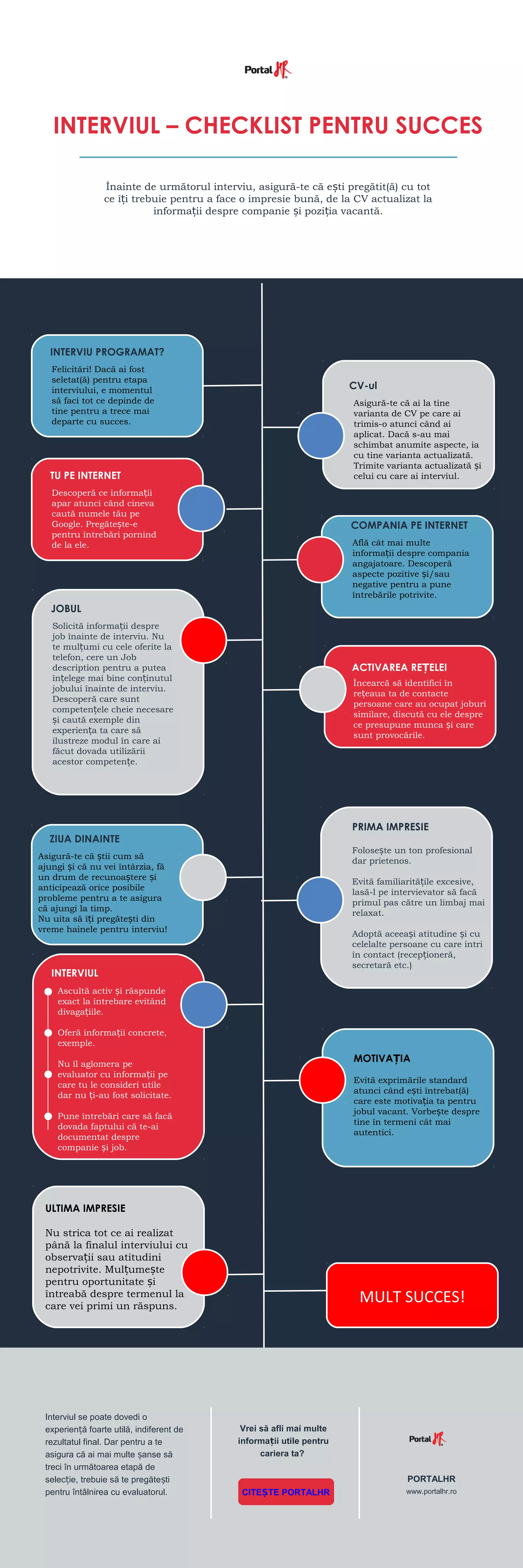 Checklist-ul pentru interviu subliniază importanța pregătirii temeinice, inclusiv actualizarea CV-ului și cercetarea companiei angajatoare. Este esențial să te pregătești pentru întrebări și să adopți o atitudine profesională și prietenoasă în timpul interviului. De asemenea, este important să păstrezi o primă și ultimă impresie pozitivă, oferind răspunsuri concrete și autentice.