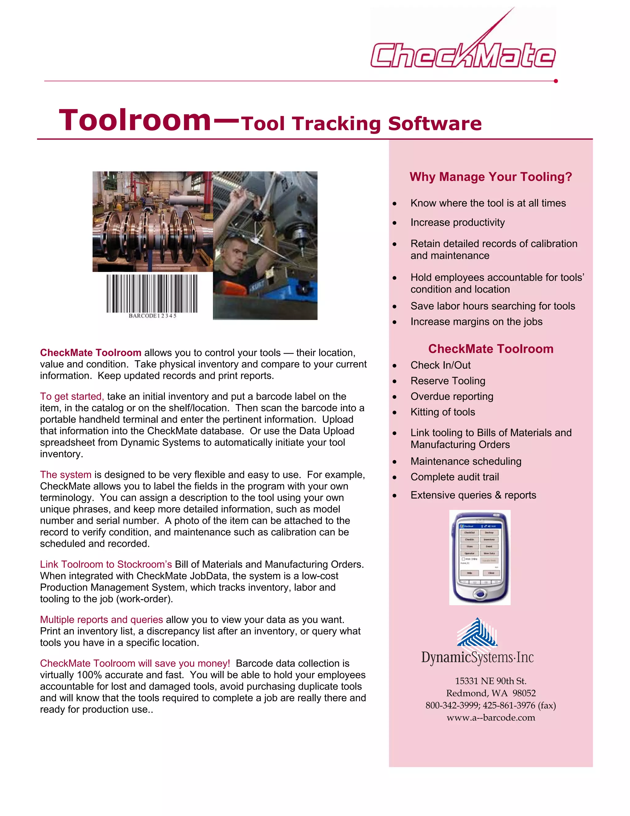 The document discusses the CheckMate Toolroom software which allows companies to track their tools and increase productivity. Some key benefits include knowing the location of tools, maintaining calibration and maintenance records, holding employees accountable, and saving time searching for tools. The software allows taking inventory, checking tools in and out, reserving tools, and generating various reports. It integrates with other CheckMate systems for job costing and inventory control.