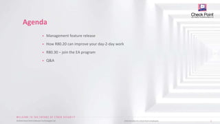 The document outlines the features and improvements of Check Point's R80.20 management release for internal employees, including enhancements to policy installation, support for multitasking, and updates regarding IPS management. It emphasizes the transition to a new Linux kernel and file system, offering benefits such as increased storage support and performance improvements. Additionally, the document encourages participation in the R80.30 early access program and discusses the availability of SmartConsole extensions.