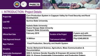 This document describes a research project on corn production systems in Cagayan Valley, Philippines. The project aimed to gather information on production systems by agro-ecological zone, identify constraints and solutions, determine technology utilization and communication networks. Key findings include identification of major corn varieties, fertilizers, and diseases by zone. A compendium of pests and diseases was produced. The agricultural information system and most used information sources of Bt corn growers were also analyzed.