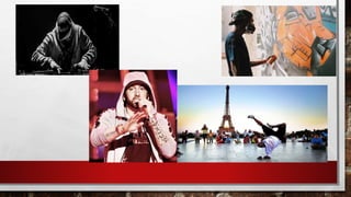 This document provides information on various hip-hop dance styles including breaking, popping, locking, house dance, voguing, and others. It describes the key elements and movements of each style. For example, it notes that breaking evolved from b-boying and includes toprock, downrock, power moves, and freezes. Popping involves body isolation and contractions to create a jerky effect. Voguing was created by the gay community and imitates model poses from magazines.