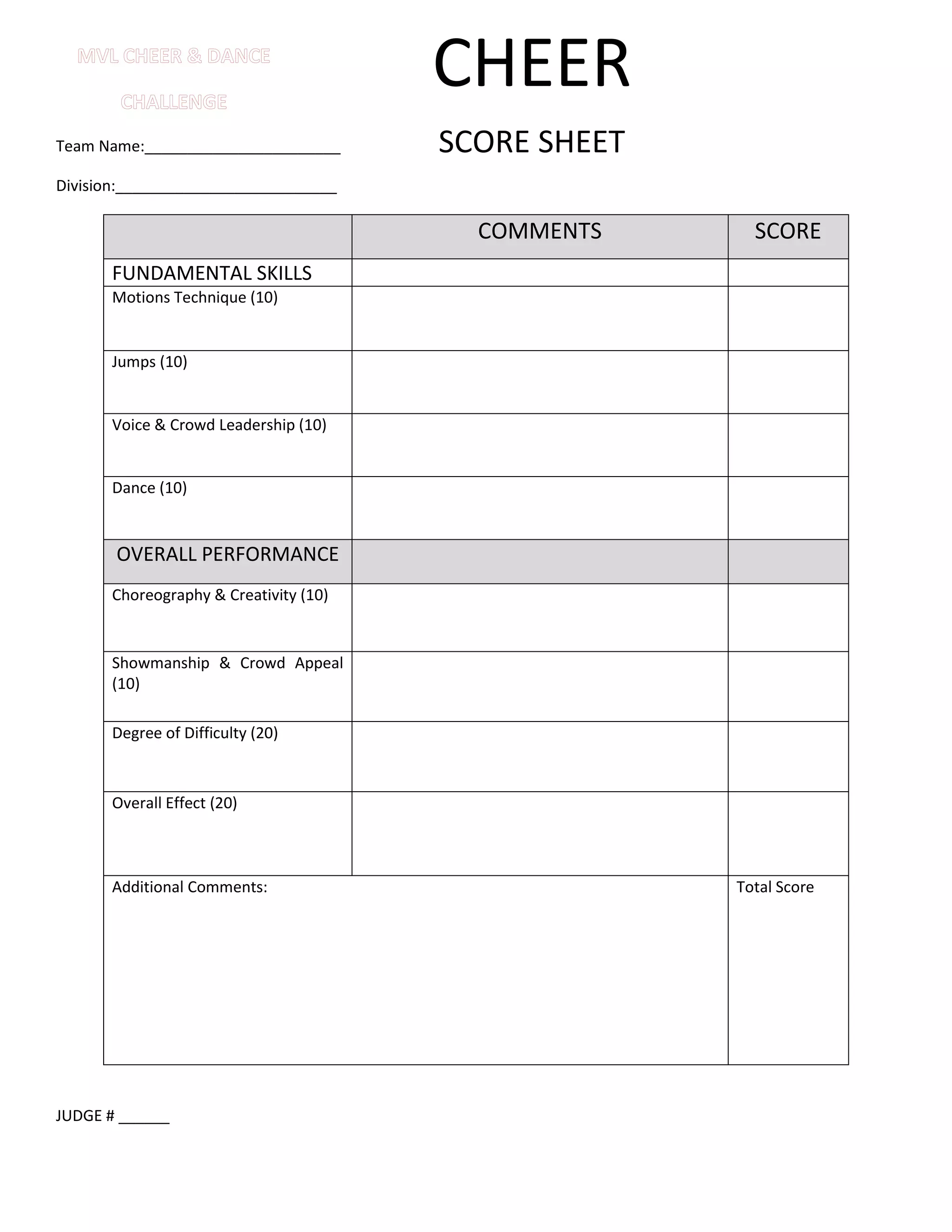 This score sheet evaluates a cheerleading team's performance based on fundamental skills like motions, jumps, voice, and dance. It also scores the overall performance, looking at the choreography and creativity, showmanship and crowd appeal, difficulty of the routine, and overall effect. The total score is calculated at the bottom.