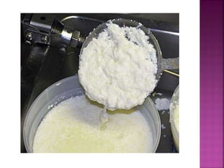 This document discusses fermentation in food processing and focuses on cheese production. It provides an introduction and history of cheese making. It describes the key types of fermentation used in cheese production and lists the microbes associated with cheese fermentation. The general cheese processing steps are outlined including standardization, pasteurization, culturing, coagulation, draining, pressing, aging, and packaging. Finally, it lists and describes common cheese types and their characteristics as well as the advantages and disadvantages of cheese consumption.