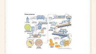The document provides a detailed overview of cheese production, from the coagulation of milk proteins to the aging process. It outlines the steps involved, including milk preparation, acidification, coagulation with rennet, curd cutting, salting, and ripening. Additionally, it includes nutritional content and classifications of various cheese types.