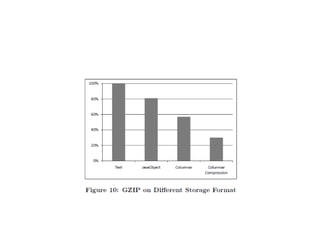 Cheetah is a custom data warehouse system built on top of Hadoop that provides high performance for storing and querying large datasets. It uses a virtual view abstraction over star and snowflake schemas to provide a simple yet powerful SQL-like query language. The system architecture utilizes MapReduce to parallelize query execution across many nodes. Cheetah employs columnar data storage and compression, multi-query optimization, and materialized views to improve query performance. Based on evaluations, Cheetah can efficiently handle both small and large queries and outperforms single-query execution when processing batches of queries together.