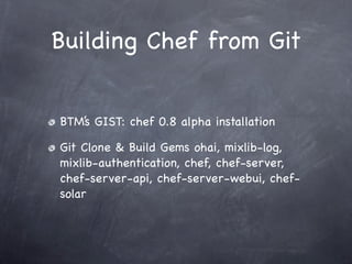 This document discusses using Chef 0.8 to build a baseline Amazon EC2 AMI with the Chef client installed. It describes cloning Chef code from Git and building related gems. It then covers setting up a generic client.rb file, instantiating an EC2 instance with the new AMI, and installing the Chef server and related gems. Finally, it discusses the development process of creating roles and cookbooks locally, uploading to the Chef server, and debugging clients running on EC2.