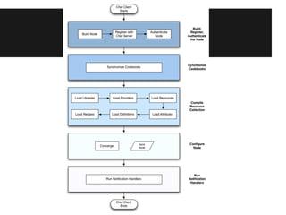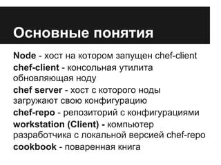 Документ описывает основные компоненты и архитектуру Chef, включая ноды, chef-server и cookbook. Он предоставляет инструкции по настройке среды разработки и управлению нодами с помощью различных команд, таких как knife и shef. Также содержатся примеры кода для работы с атрибутами, репозиториями и deploy-скриптами.