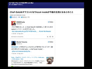 なる事もあるので注意しましょう •コミュニティクックブックは使いたい けどどれ使っていいか問題はある •みんなChefかければ無理に集約しなく てもいいと思います。