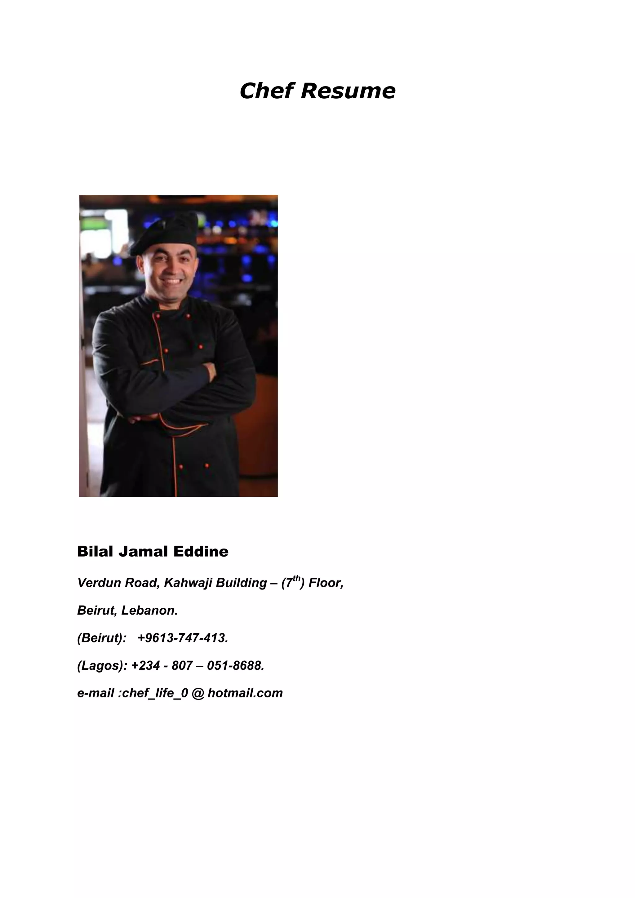 Bilal Jamal Eddine is an experienced executive chef with over 18 years in food production, menu planning, and employee supervision across various international locations. His professional history includes roles at Bungalow Restaurant in Nigeria and Health Quest Catering Services in the UAE, where he demonstrated exceptional skills in kitchen management and food safety. Fluent in English, Arabic, and Russian, Eddine has also undergone professional training in hotel management and catering.