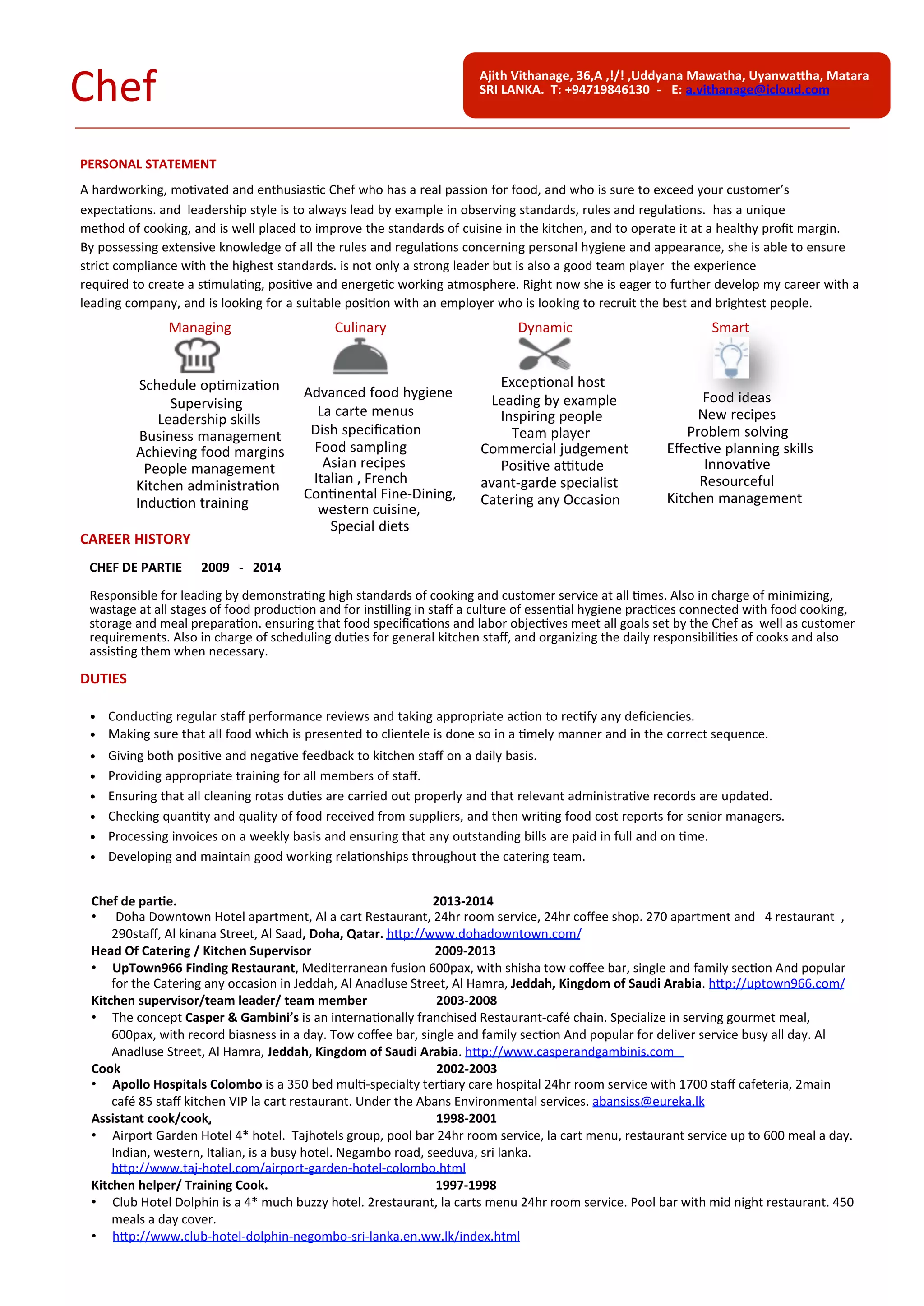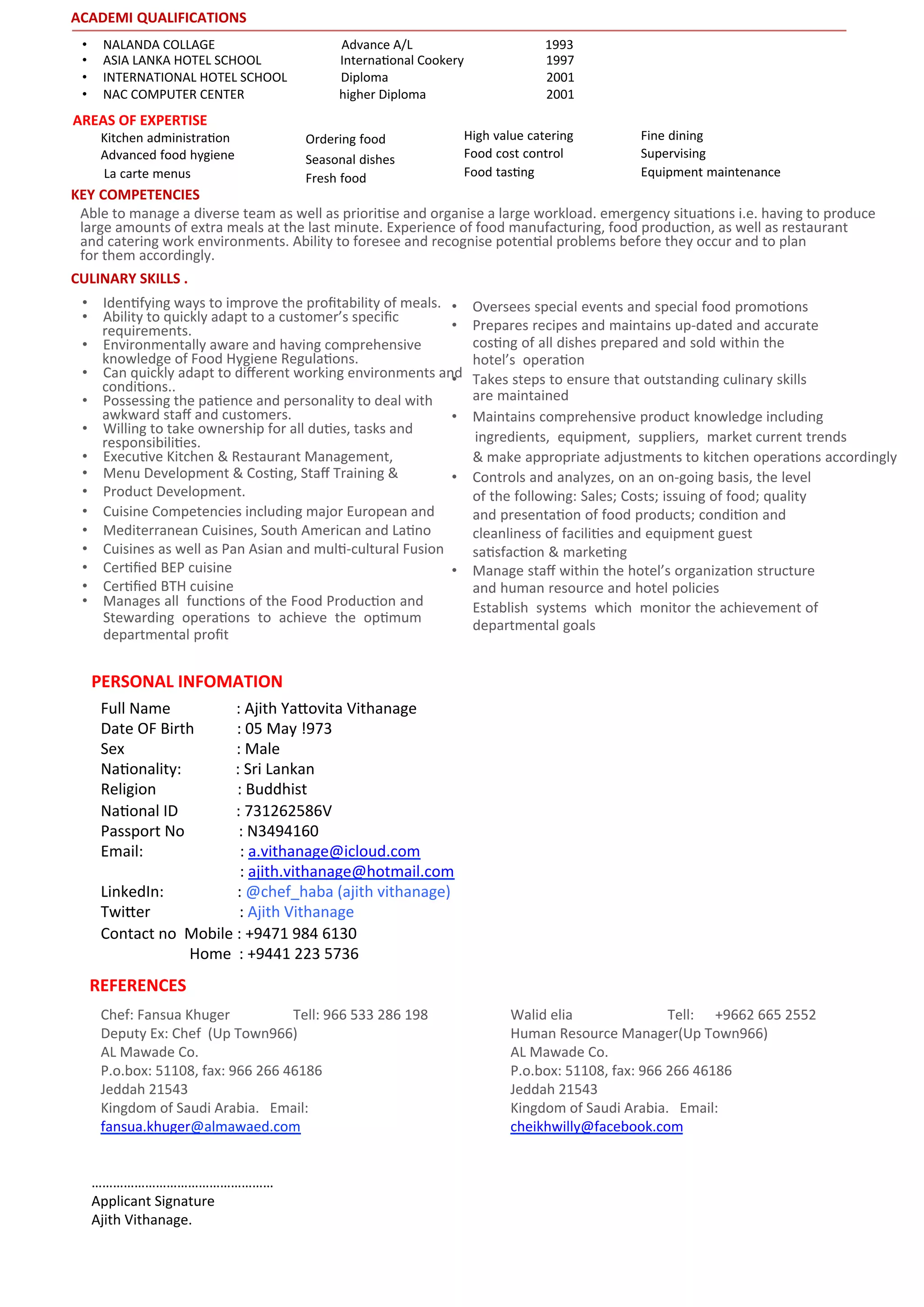 This document is a resume for Ajith Vithanage, a 36-year-old Sri Lankan chef. It summarizes his career experience working in kitchens and restaurants in Sri Lanka, Qatar, and Saudi Arabia over the past 20 years, rising from a kitchen helper to positions like Head Chef and Kitchen Supervisor. It also lists his culinary skills and qualifications, including degrees in cookery and computer skills. References are provided from previous employers praising his leadership abilities and professionalism in the kitchen.