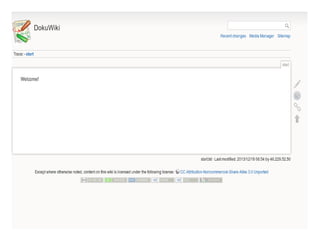 The document outlines day 5 of a DevOps workshop focused on using Opscode Chef, including the installation and configuration of DokuWiki on Windows and Ubuntu. Key topics covered include knife plugins, managing nodes, and the step-by-step process for downloading and setting up DokuWiki, modifying file permissions, and applying security measures. It emphasizes the use of community cookbooks and specific resources for executing tasks such as downloading tarballs and managing Apache settings.