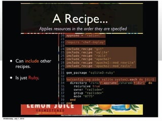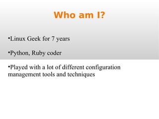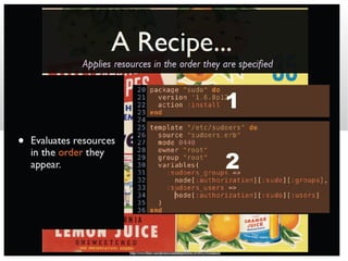 This document provides an overview of Chef, a configuration management tool. It discusses how Chef works using a client-server model to configure nodes according to their run lists and roles. Cookbooks contain recipes that specify resources to configure nodes. Chef helps ensure consistency across environments like development, testing, and production.