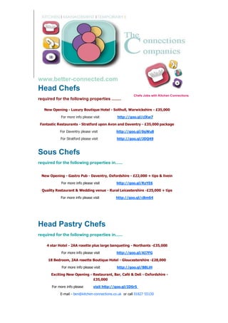 The document lists several chef job openings at various properties in the UK, including head chef positions at a luxury boutique hotel paying £35,000, fantastic restaurants in Stratford upon Avon and Daventry also paying £35,000. Sous chef positions are available at a gastro pub in Daventry paying £22,000 + tips and live-in, and a quality restaurant and wedding venue in rural Leicestershire paying £25,000 + tips. Head pastry chef roles are open at a 4 star hotel in Northants paying £35,000, an 18 bedroom boutique hotel in Gloucestershire paying £28,000, and an exciting new opening in Oxfordshire paying £35,000.