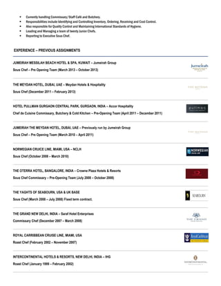 This career abstract summarizes the qualifications and experience of a seasoned professional chef with over 19 years of experience working in prestigious hotels and cruise lines. The chef has extensive experience in pre-opening teams and has successfully led pre-opening assignments for 8 hotels. He has a proven track record of managing kitchen teams and has received several awards for his work in cost control, food safety, and customer satisfaction. Currently he works as the Chef de Cuisine for the pre-opening team of the Waldorf Astoria Dubai Palm Jumeirah.