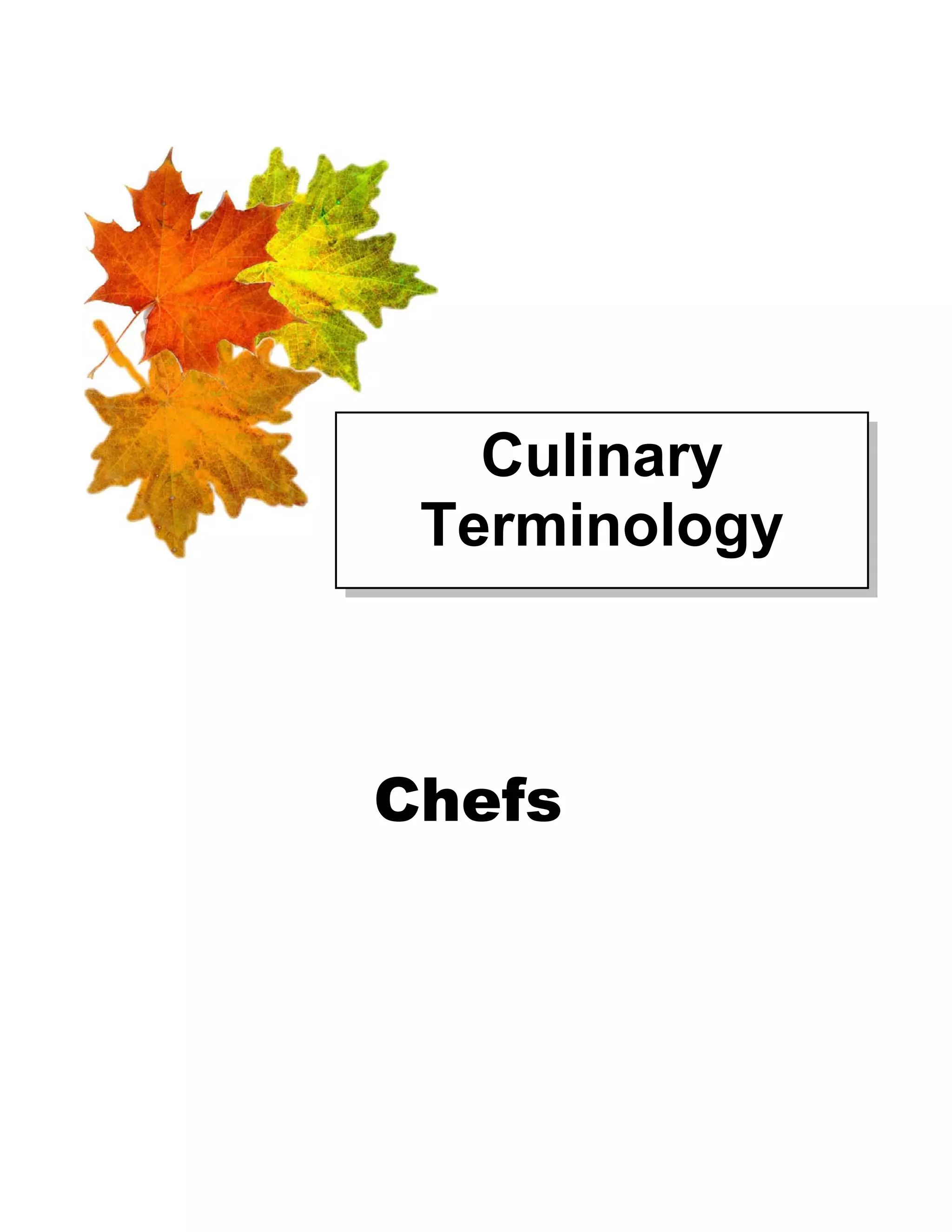 This document provides an introduction and overview of culinary terminology for chefs. It includes sections defining common cooking processes and technical terms related to French cooking, sanitization, safety, and more. Various self-tests and answer keys are included to help readers test their understanding of the material. Funding for the project was provided by the Citizenship and Multicultural Division of the Manitoba Department of Labour and Immigration.