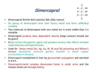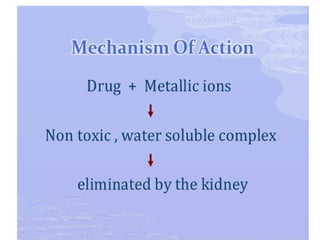 Chelating agents are drugs that form ring structures by binding to metallic ions. They are used to treat heavy metal intoxications by preventing metals from binding to biological ligands. An ideal chelator has the ability to reach sites of metal storage and form stable, non-toxic complexes that are excreted easily. It should have low affinity for essential metals like calcium and zinc. Common chelating agents include penicillamine, trientine, EDTA, deferoxamine, deferiprone, succimer, DMPS, and dimercaprol. Each agent has different mechanisms of action, routes of administration, targeted metals, and side effect profiles. Chelation therapy helps mobilize and eliminate toxic heavy metals from