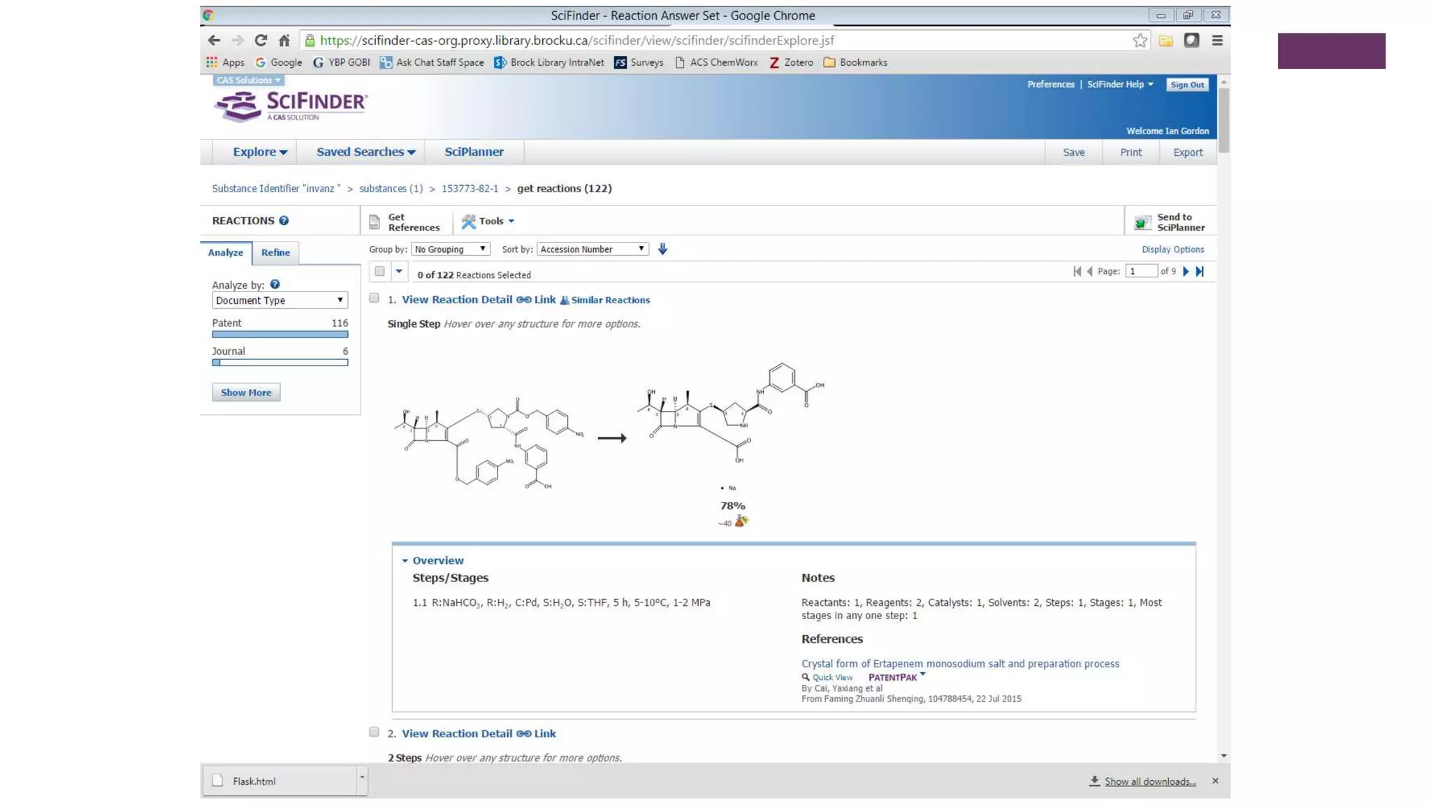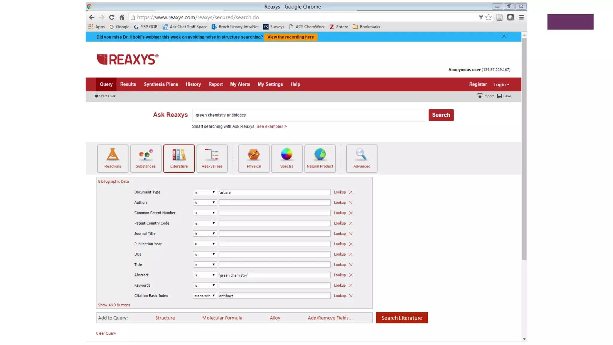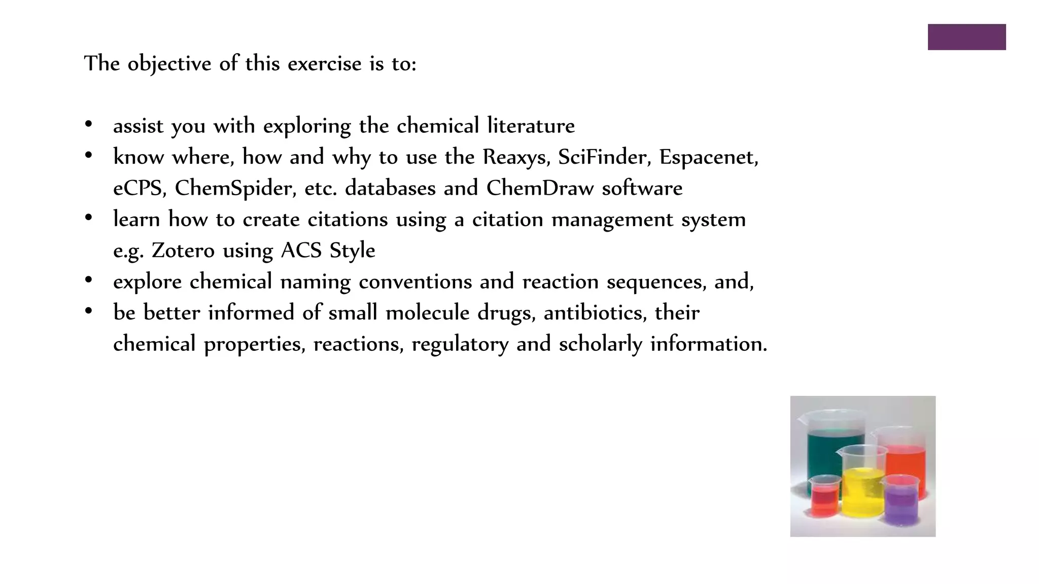This document outlines an exercise to help students explore chemical literature and databases. It asks students to select an antibiotic or drug to research using tools like Reaxys, SciFinder, eCPS and ChemDraw. For the selected drug, students are asked to summarize its importance and bioactivity, identify a reaction that could be reproduced in the lab, discuss if a referenced reaction demonstrates green chemistry principles, and summarize a cited patent using one or two sentences. The exercise aims to help students learn search strategies and skills for exploring chemical properties, reactions, and scholarly information on small molecule drugs.