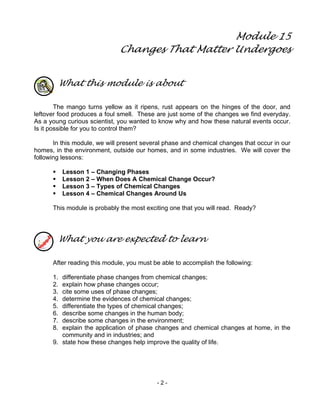This module discusses various chemical and phase changes that occur in everyday life. It is divided into four lessons: (1) Changing Phases explains the differences between melting, freezing, evaporation, condensation, sublimation and deposition; (2) When Does a Chemical Change Occur? describes the indicators of a chemical change and differentiates chemical from physical changes; (3) Types of Chemical Changes outlines four types of chemical reactions - combination, decomposition, single replacement and double displacement; (4) Chemical Changes Around Us provides examples of changes that happen in the human body during digestion and exercise as well as in cleaning products like soap. The module aims to help students understand and identify different types of changes in their environment.