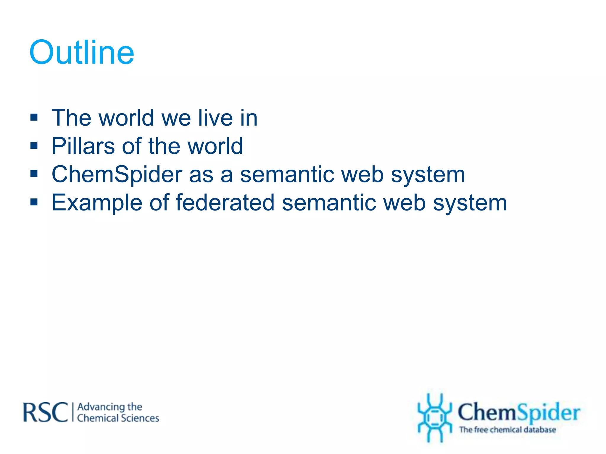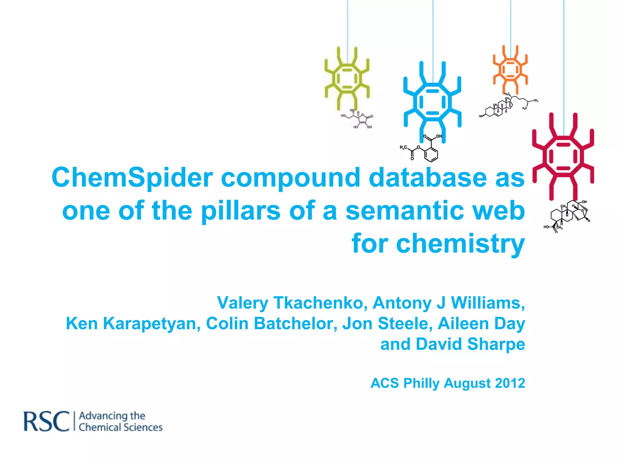 This document discusses ChemSpider, a database of small organic molecules, as one of the pillars of a semantic web for chemistry. It provides an overview of ChemSpider's capabilities, including its large database containing properties, names, and spectra of molecules. Users can contribute new data or curate existing data through an easy deposition system. ChemSpider also functions as a search engine for chemistry, allowing users to search and navigate relationships between molecules. The system utilizes extensive computing infrastructure and standardized interfaces like APIs. It is presented as an example of a federated semantic web system for chemistry that incorporates data from multiple sources using open standards.