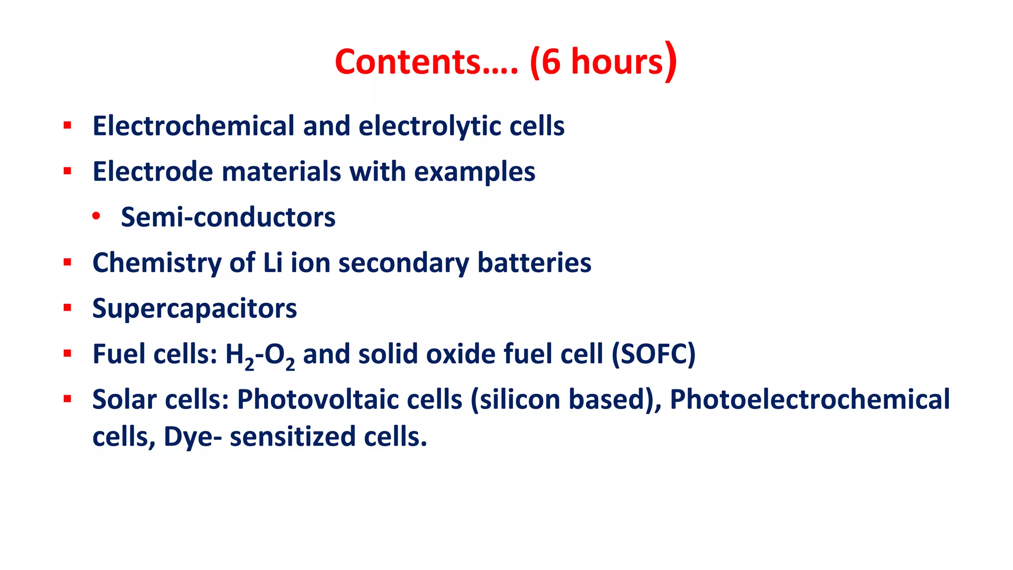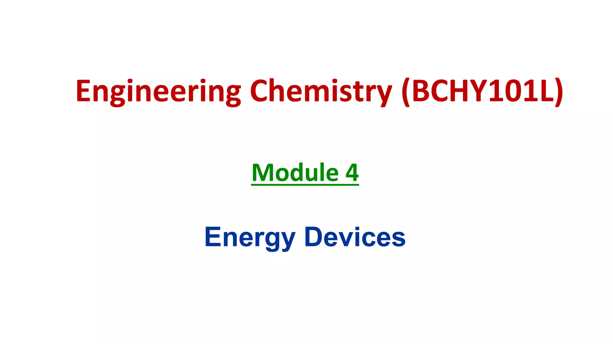 This document provides an overview of various energy devices and related chemistry concepts covered in the Engineering Chemistry module. It discusses electrochemical cells, electrode materials, semiconductors, lithium-ion batteries, fuel cells, and solar cells. It also covers topics like electrolysis, electroplating, and the preparation and doping of semiconductors.