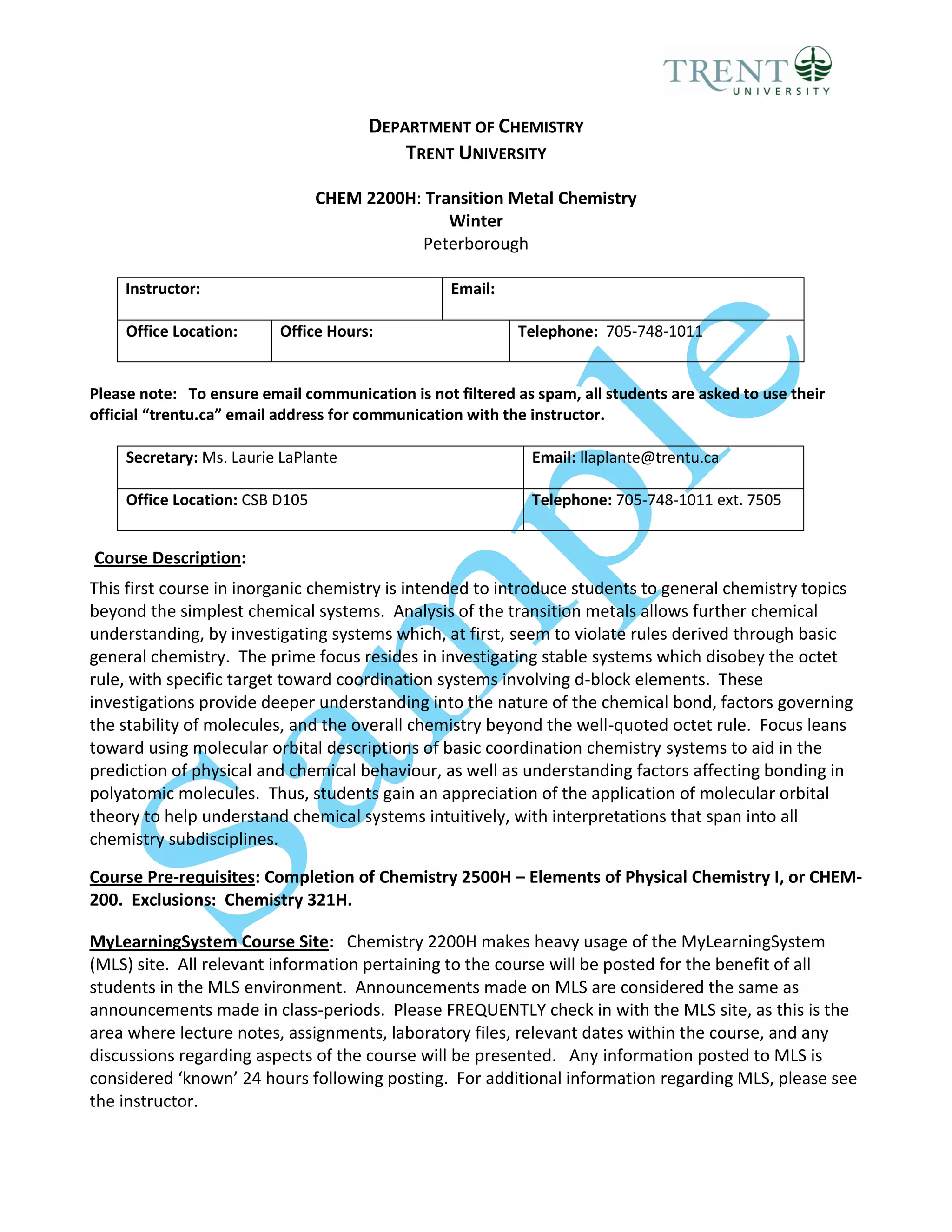 This document provides information about the CHEM 2200H Transition Metal Chemistry course offered at Trent University during the winter term. It outlines the course details including instructor and secretary contact information, course description, format, evaluation components, textbook requirements, tentative schedule, and department and university policies. The course is an introduction to transition metal chemistry focusing on coordination systems and using molecular orbital theory to understand physical and chemical behaviors. It includes lectures, a laboratory component, assignments, reports, a midterm exam, and a final exam.
