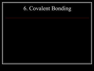 This document discusses covalent bonding and molecular structures. It defines covalent bonds as bonds formed by shared electron pairs between atoms. It explains that molecules are groups of atoms held together by covalent bonds in a specific ratio and shape. The document discusses drawing Lewis dot structures and molecular diagrams to represent molecules and the bonding between their atoms. It provides examples of drawing the Lewis dot structure for carbon tetrachloride and matching molecular diagrams to chemical formulas.