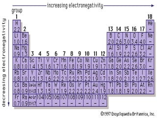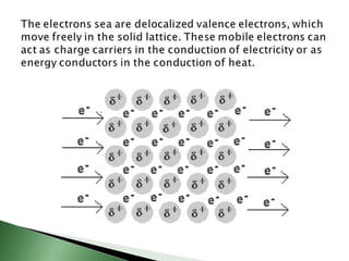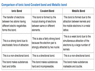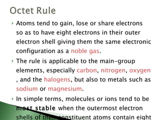 Chemical bonding involves atoms forming stable electronic configurations through gaining, losing or sharing electrons. Ionic bonds form between metals and nonmetals when electrons are transferred, while covalent bonds involve sharing electron pairs between nonmetals to achieve stable octets. Different bond types including ionic, covalent and metallic bonding can be identified based on the participating elements and electron configurations involved.