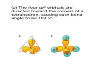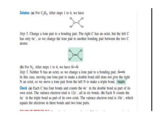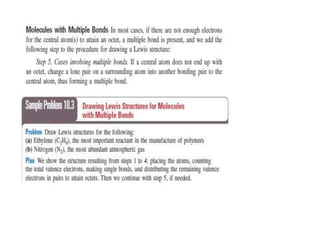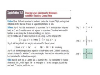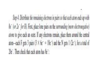 3. The shape and properties of molecules can be predicted using Lewis structures, the valence shell electron pair repulsion (VSEPR) model, and by determining the hybridization of the atoms' orbitals. This allows for determining important characteristics like molecular geometry.