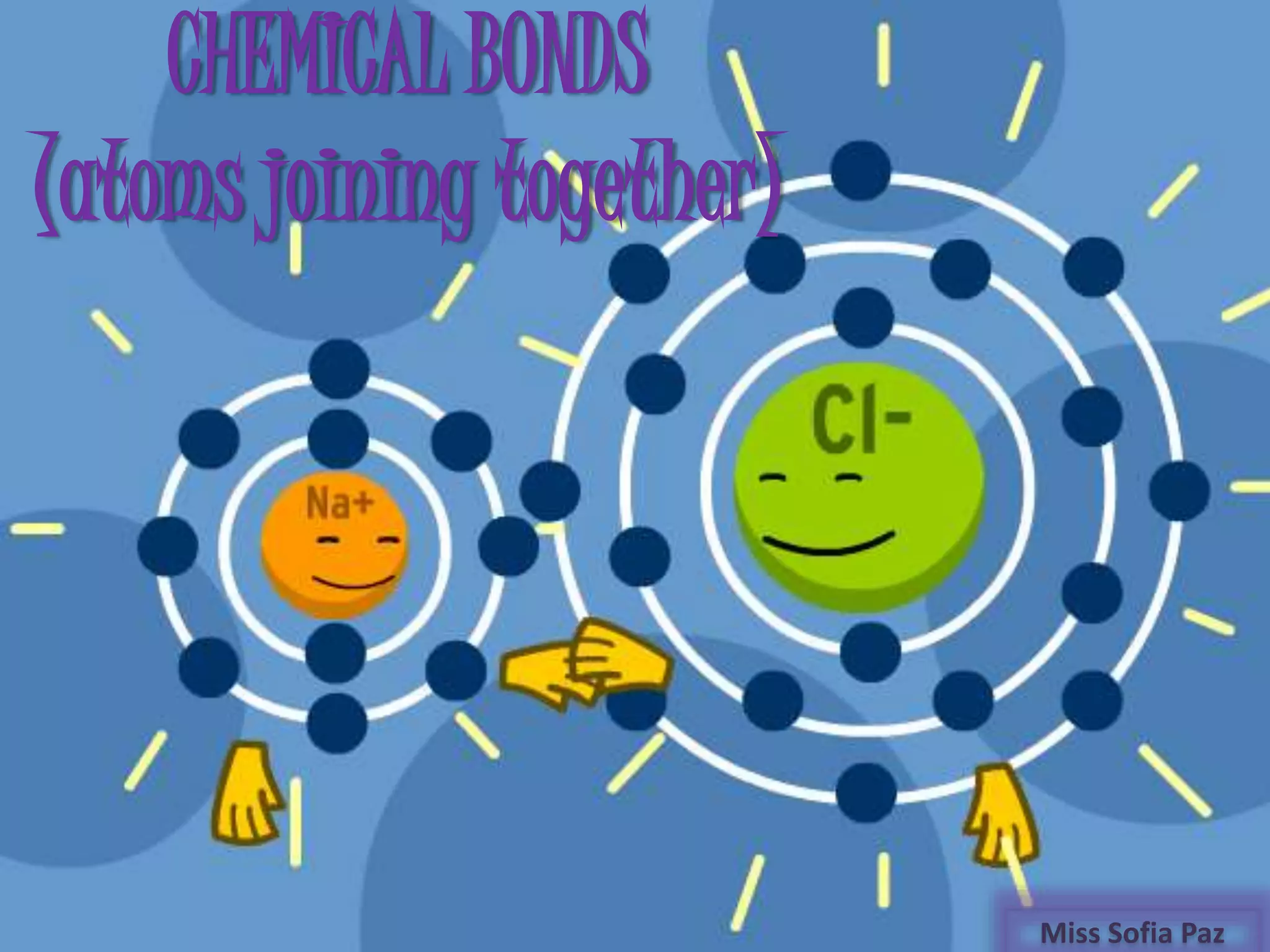 This document discusses different types of chemical bonds: ionic bonds form when one atom transfers an electron to another atom due to differences in electronegativity, while covalent bonds form when atoms share electrons due to similar electronegativity. Ionic bonds result in charged ions, while covalent bonds can be nonpolar or polar depending on electronegativity differences. Water is an example of a polar covalent molecule with partial charges on the oxygen and hydrogen ends. Hydrogen bonds are electrostatic attractions between polar molecules that are stronger than other intermolecular forces.