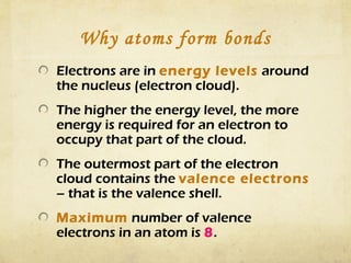 Atoms form bonds by gaining, losing, or sharing electrons to attain a stable electron configuration with 8 valence electrons, known as an octet. Ionic bonds form when atoms transfer electrons to become ions with opposite charges that are attracted to each other. Covalent bonds form when atoms share electrons to attain a full outer shell. Common diatomic molecules that form through covalent bonding include hydrogen (H2), oxygen (O2), nitrogen (N2), fluorine (F2), chlorine (Cl2), bromine (Br2), and iodine (I2). Ionic bonds typically form between metals and nonmetals, while covalent bonds form between two nonmetals.