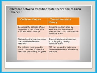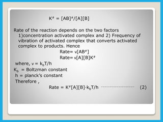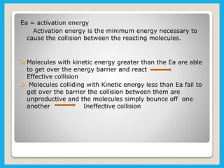 Chemical dynamics is a branch of physical chemistry that examines the rates and mechanisms of reactions, focusing on energy transfer at atomic scales. Key concepts include the Arrhenius equation, activation energy, and kinetic theories that describe how temperature and catalysts influence reaction rates. Additionally, the document covers chain reactions, steady-state kinetics, and the effects of ionic strength on reaction rates in solutions.