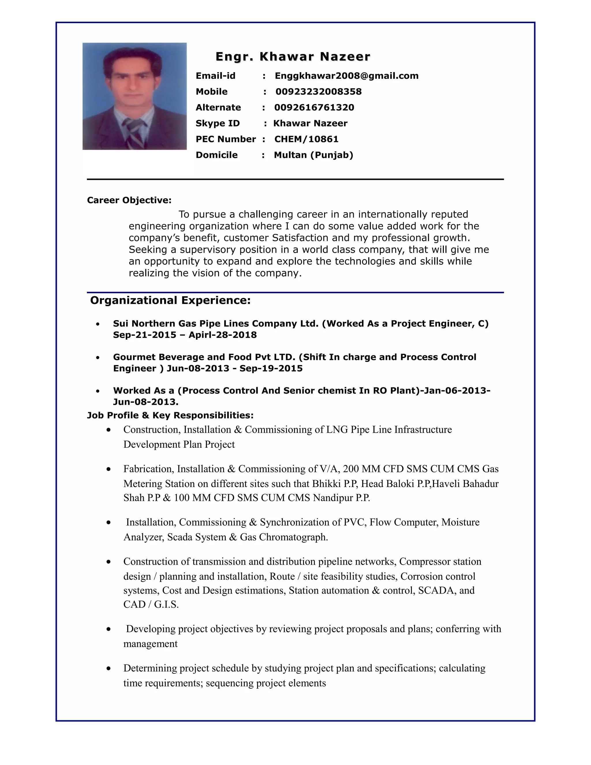 Engr. Khawar Nazeer is a chemical engineer based in Multan, Pakistan, with experience in project engineering, process control, and pipeline infrastructure development. He has held positions at Sui Northern Gas Pipelines and Gourmet Beverage and Food Pvt Ltd, overseeing installation, commissioning, and quality control of various engineering projects. Khawar possesses strong technical skills, effective communication abilities, and has completed multiple internships, along with certifications in health and safety.