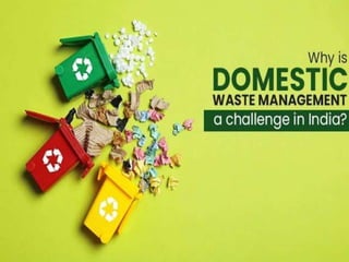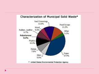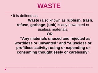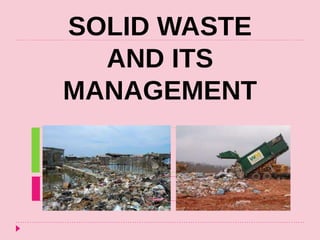 This document discusses solid waste and its management. It defines solid waste and describes its various types including municipal solid waste, hazardous waste, and hospital waste. The sources of solid waste are identified as domestic, commercial, industrial, and agricultural wastes. Population growth, increased affluence, and technological advances have led to greater solid waste generation. Improper waste management can pose health hazards and environmental impacts through disease outbreaks and pollution. The document recommends following the 4Rs approach of reduce, reuse, recycle, and refuse to better manage solid waste.