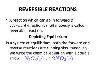 This document discusses the key concepts of chemical equilibrium. It defines reversible reactions as those that can proceed in both the forward and backward directions simultaneously. At equilibrium, the rates of the forward and reverse reactions are equal and the concentrations of reactants and products remain constant. Several examples of reversible reactions are provided. Characteristics of chemical equilibrium include the constancy of concentrations at equilibrium and the independence of the equilibrium constant from the initial concentrations. Le Chatelier's principle is introduced, which states that if a system at equilibrium experiences a change, it will shift its position to counteract that change. The effects of changing concentration, pressure, temperature, and adding a catalyst are described based on this principle. Industrial processes for maximizing yields of important chemicals