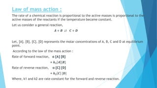 1) Chemical equilibrium occurs when the rates of the forward and reverse reactions are equal. The law of mass action states that the rate of a reaction depends on the concentrations of reactants.