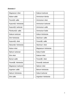 This document contains information about chemical formulas and relative molecular/formula masses. It includes a list of common ions and their formulas. There are also exercises providing the chemical formulas of compounds and calculating their relative molecular/formula masses. Some example calculations shown include copper(II) chloride with a relative formula mass of 135 and potassium chloride with a relative formula mass of 74.5. The document appears to be teaching materials for a chemistry module covering chemical formulas and relative molecular/formula mass calculations.