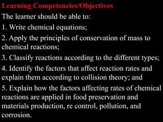 This document provides an overview of key concepts related to chemical reactions, including writing and balancing chemical equations, factors that affect reaction rates such as concentration, temperature, surface area, and catalysts. It also discusses how an understanding of reaction rates can be applied to food preservation, materials production, pollution control, and corrosion prevention. A pre-assessment with multiple choice and true/false questions is included to gauge students' existing knowledge on these topics.