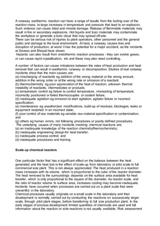 Thermal runaways can occur in exothermic chemical reactions if the rate of heat production exceeds the rate of heat removal. This can cause a dangerous escalating temperature increase. Several factors contribute to runaways during scale-up from small-scale experiments to large industrial reactors, as heat removal does not scale linearly with size. Proper risk assessment and gradual scale-up through pilot plants is necessary to identify hazards and establish safe operating conditions before commercial production.
