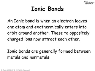 There are three main types of chemical bonds: ionic bonds, covalent bonds, and hydrogen bonds. Ionic bonds involve the transfer of electrons between metals and nonmetals, resulting in oppositely charged ions that are attracted to each other. Covalent bonds involve the sharing of electrons between two atoms. Hydrogen bonds are attractive forces between a hydrogen atom covalently bonded to an electronegative atom, like oxygen or nitrogen, and another electronegative atom.