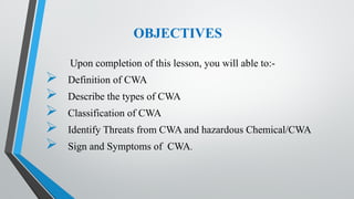 Ex. HCN(Blood agent), Sarin(GB), Soman(GD), Tabun(GA)