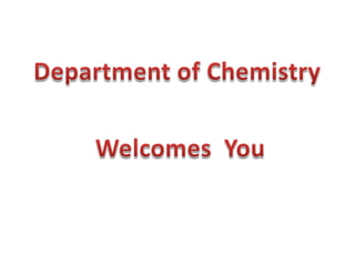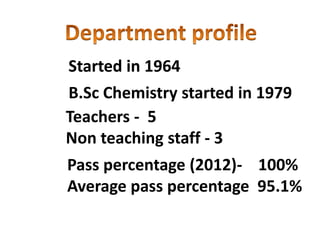 This document provides information about a chemistry department that started in 1964 and began offering a B.Sc in Chemistry in 1979. It currently has 5 teachers and 3 non-teaching staff, and has averaged a 95.1% pass percentage over the years, with a 100% pass rate in 2012. The document then lists the 5 current faculty members, their qualifications and areas of research which include polysaccharides, bioinorganic chemistry, natural products, and polymer chemistry.