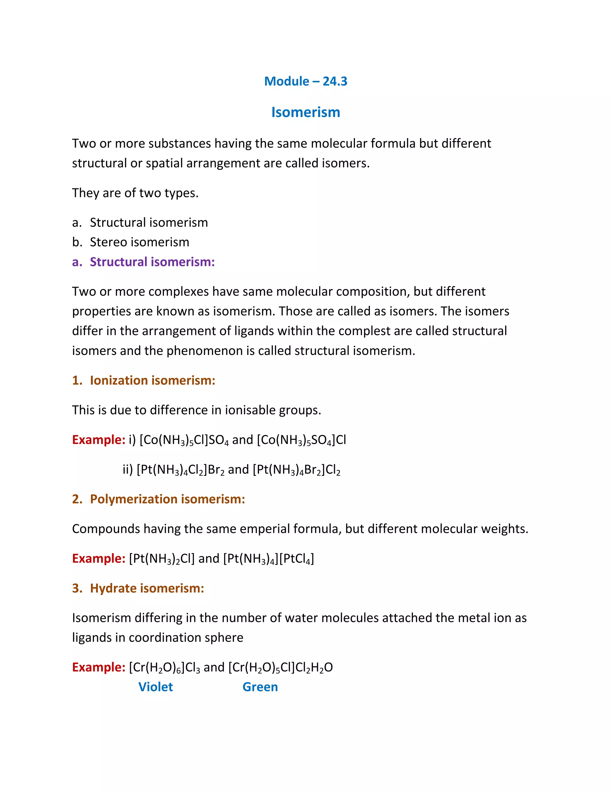 The document discusses different types of isomerism seen in coordination compounds, including structural isomerism (ionization, polymerization, hydrate, linkage, coordination, ligand isomerism) and stereoisomerism (geometric, optical isomerism). It provides examples of each type of isomerism. It also discusses the number of possible isomers for coordination compounds based on their coordination number and ligand arrangement.
