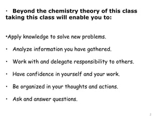 This document provides an introduction to CHEM 1101 and covers several key chemistry concepts. It introduces the instructor, Dr. Muhannad Amer, and discusses the scientific method and how it is used in chemistry. It also defines and compares scientific theories and laws. Additionally, it covers important topics such as the International System of Units (SI units), dimensional analysis, density, temperature scales, and significant figures.