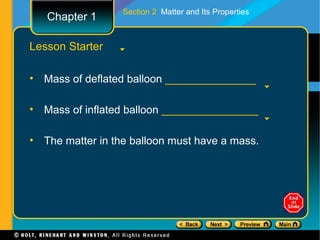 The document covers different topics relating to matter and its properties including the basic building blocks of matter such as atoms and elements, physical and chemical properties, physical and chemical changes, different states of matter, classifying matter as pure substances or mixtures, and energy changes that occur during physical and chemical changes. Key concepts discussed include properties of matter, the structure of atoms and molecules, distinguishing between physical and chemical changes, and classifying different types of mixtures and pure substances.