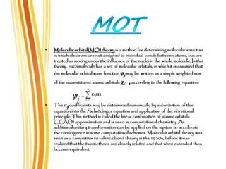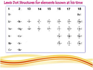Lewis and Kossel were the first to successfully explain chemical bonding in terms of electrons. They proposed that atoms bond to achieve stable electron configurations like noble gases. Lewis pictured atoms as a positively charged nucleus surrounded by 8 electrons. Atoms bond by transferring or sharing electrons to achieve stable octets. Lewis symbols were introduced to represent valence electrons. Covalent bonds form when atoms share valence electrons in order to gain full outer shells. Resonance structures represent situations where no single Lewis structure adequately describes the molecule.