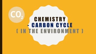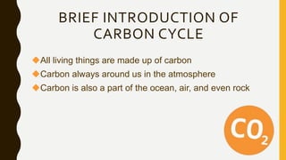 Carbon is essential for all life and circulates between the atmosphere, organisms, oceans, and Earth's crust through the carbon cycle. The carbon cycle involves carbon dioxide being taken up by plants through photosynthesis and used to fuel their growth, then released back into the air by animals and decomposers or stored long-term in fossil fuels and ocean sinks. Carbon is constantly circulating between the air, living things, and Earth's surface over many thousands of years through natural processes that sustain life.